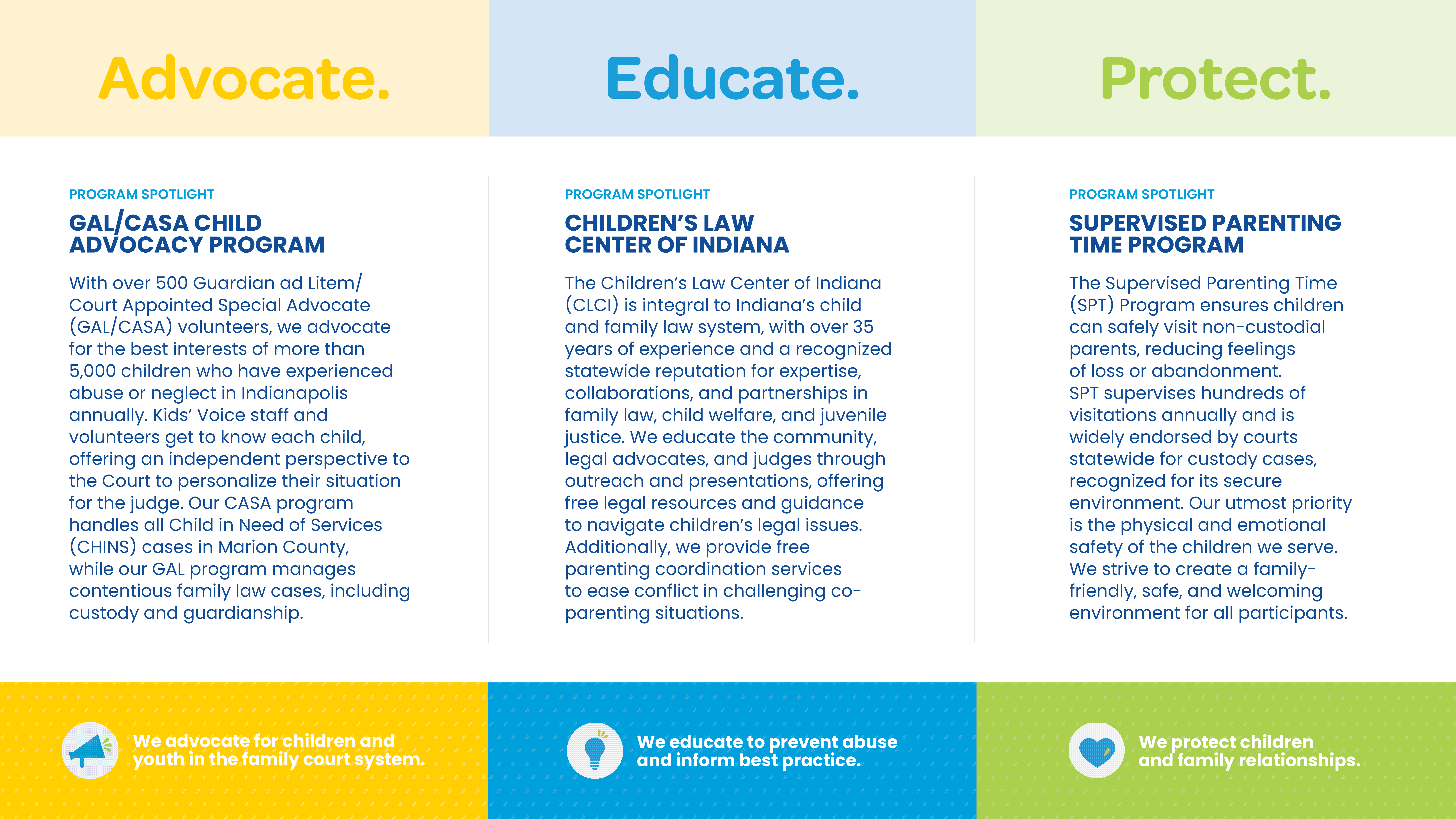 - Court Appointed Special Advocate (CASA) Volunteers: CASA volunteers advocate for children who have experienced abuse or neglect. As the CASA program for Marion County, Kids’ Voice trains and supports dedicated volunteers who ensure children’s best interests are represented in court. CASA volunteers receive extensive training and ongoing guidance from Kids’ Voice staff once assigned to a case. Learn more about becoming a CASA volunteer.